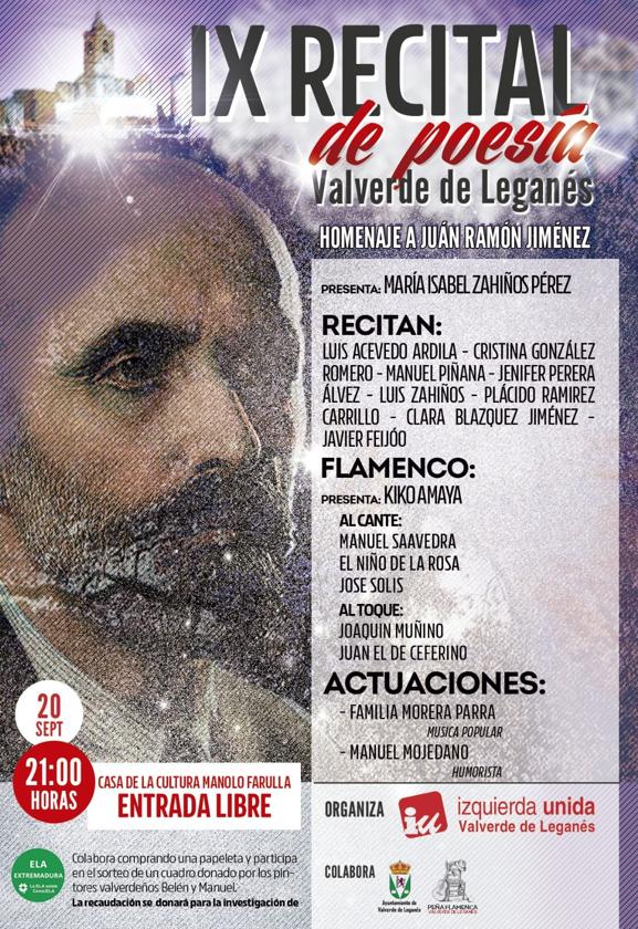 Este sábado, 20 de septiembre, a las 21.00 horas, la Casa de la Cultura de Valverde de Leganés acogerá la novena edición del Recital de Poesía, un evento que se ha convertido en una cita cultural imprescindible en el municipio y que este año homenajeará al escritor Juan Ramón Jiménez, ganador del Premio Nobel de Literatura en 1956 por el conjunto de su obra, entre la que destaca la obra lírica en prosa Platero y yo.