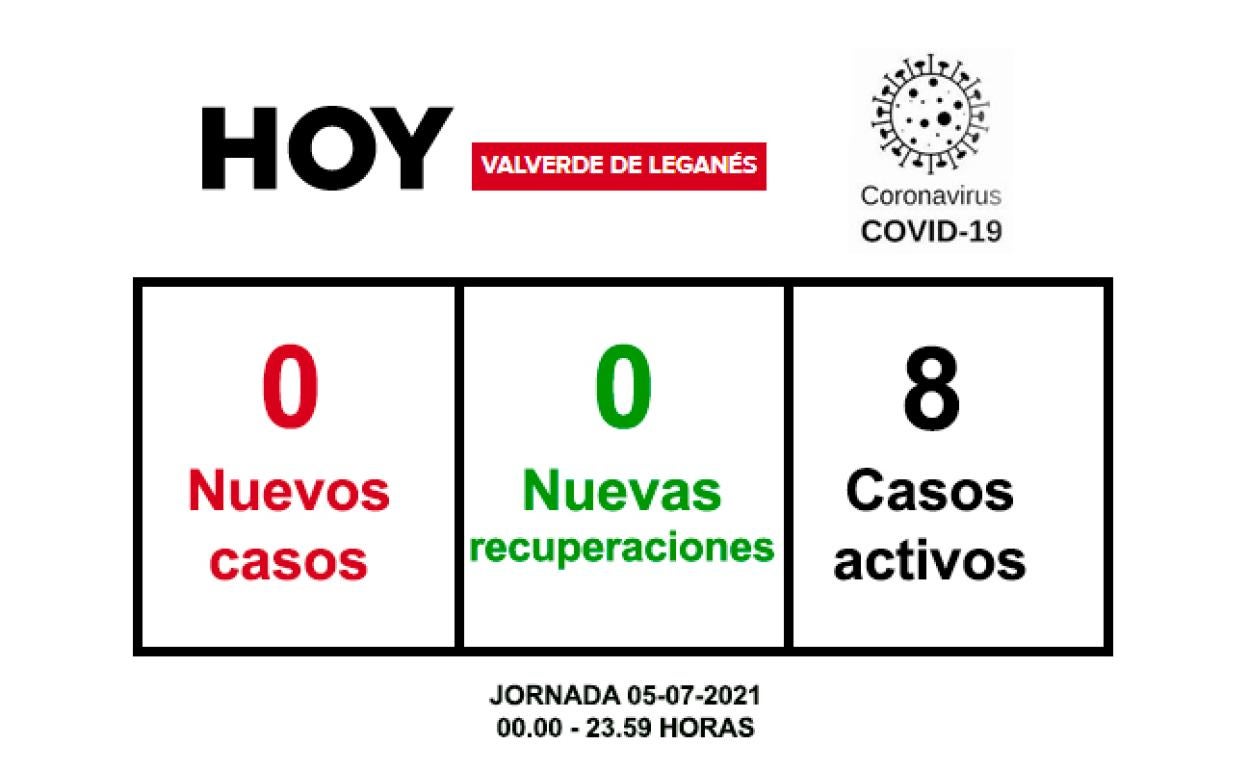 La jornada de este lunes 5 de julio no ha dejando nuevos positivos ni recuperaciones en Valverde de Leganés. Por lo tanto, el número de ... casos activos en la localidad es de 8.