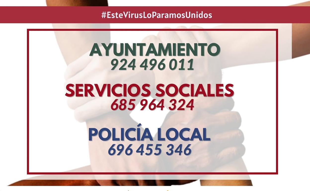 Por ello, todas aquellas personas que necesiten contactar con el Consistorio pueden hacerlo en el 924 49 60 11; los que necesiten ponerse en contacto con los Servicios Sociales de Base, tienen el 685 964 324; y los que necesiten la ayuda de la Policía Local, pueden llamar al 696 455 346.