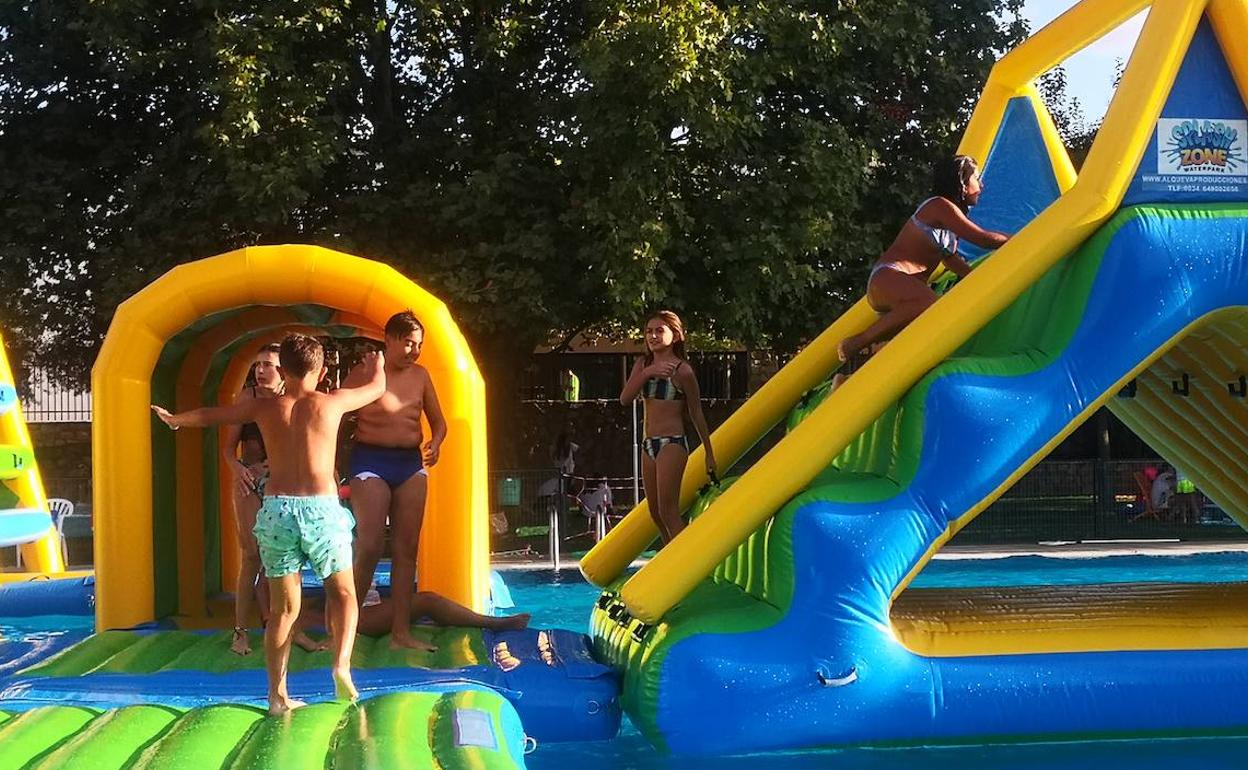 Pequeños y no tan pequeños disfrutan de los hinchables en la piscina