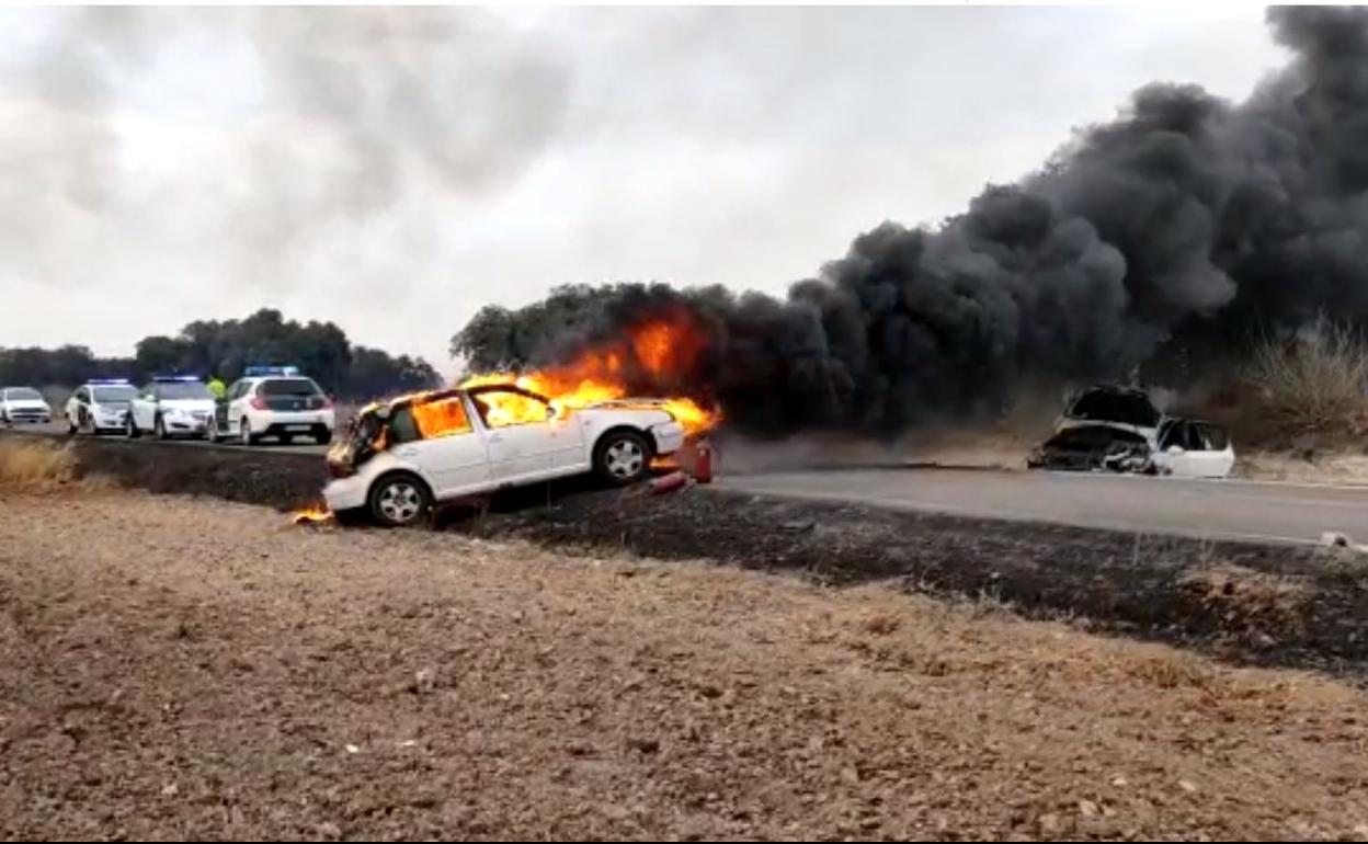 Como consecuencia del fuerte impacto, uno de los vehículos ha terminado en llamas. Según la Cruz Roja, los dos conductores, uno vecino de Badajoz y el otro de Valverde de Leganés, han resultado ilesos. En uno de los vehículos viajaba otra persona que también ha resultado ilesa.