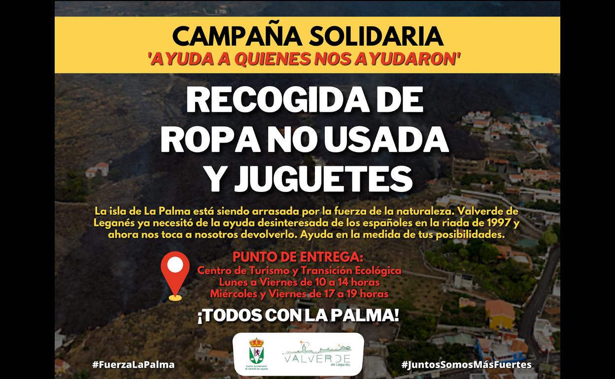 El Ayuntamiento de Valverde de Leganés ha puesto en marcha otra campaña solidaria para la recogida de ropa no usada y juguetes que irán destinados ... a los afectados por la erupción del volcán Cumbre Vieja en La Palma. Se une esta campaña a la que ya se anunció con la creación de varias cuentas bancarias para hacer aportaciones económicas.