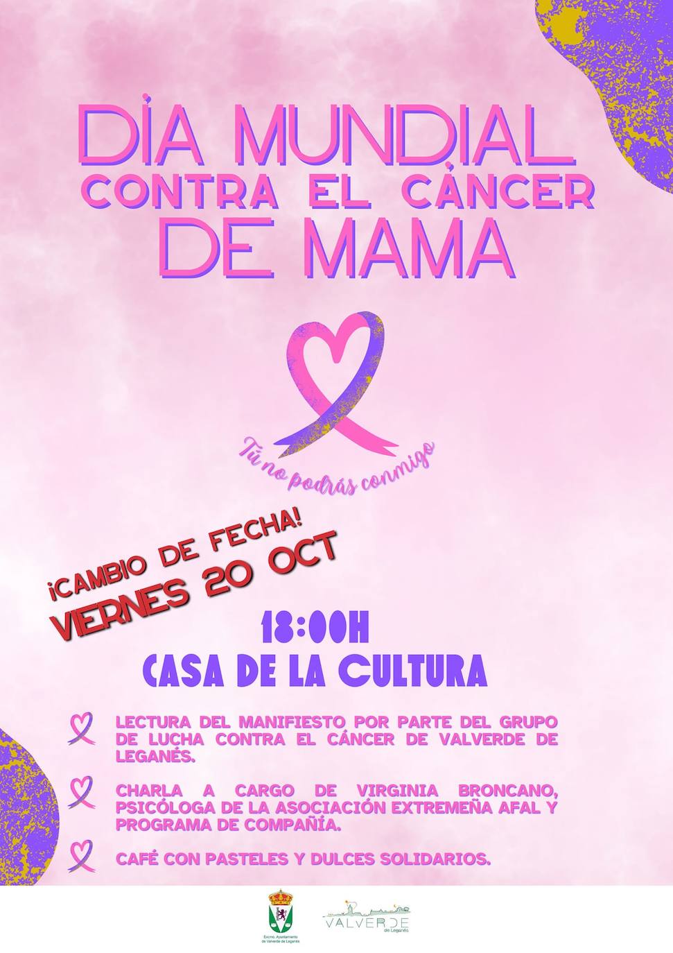 Este jueves, 19 de octubre, se celebra el Día Internacional Contra el Cáncer de Mama. En Valverde de Leganés, desde el Grupo Local de Afectadas y el Ayuntamiento habían programado una serie de actividades para esta misma tarde que finalmente han sido aplazadas a este viernes por las previsiones meteorológicas.