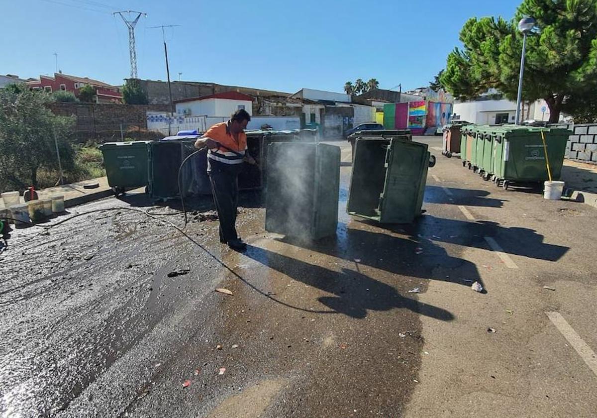 Las tareas se han llevado a cabo durante varias mañanas en las zonas más comunes donde las realizan, en la calle del mercadillo y en la zona de aparcamientos del pabellón polideportivo. Hasta estos lugares han sido trasladados los contenedores y los operarios han procedido con los trabajos con un compresor de agua y productos de desinfección.