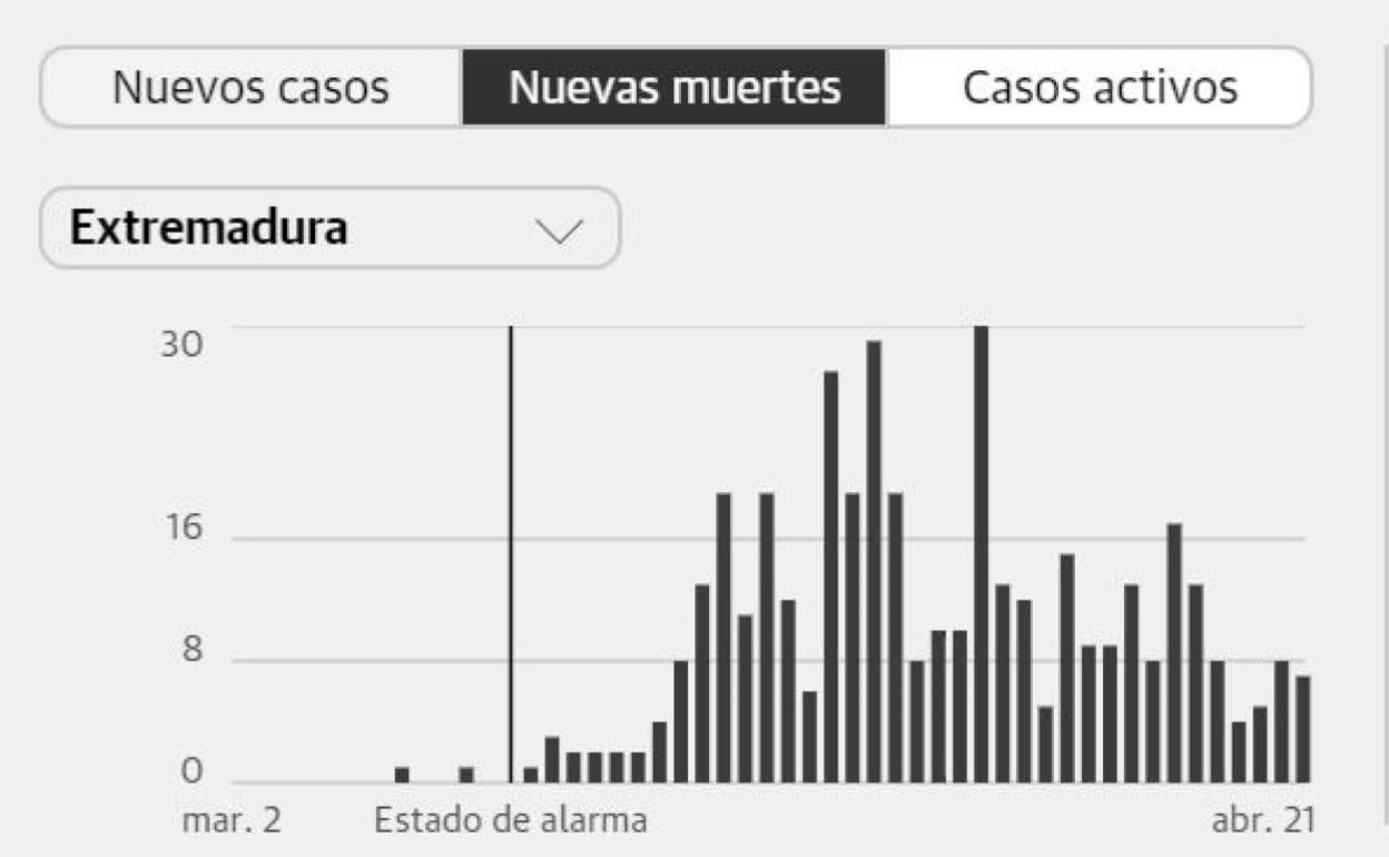 En lo que fallecidos se refiere, continúan por debajo de los diez. En esta ocasión han sido 7, uno menos que el día anterior. En total, han fallecido en Extremadura, 404 personas, lo que supone el 12,50 %.