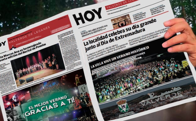 Este miércoles 14 de septiembre se publica la edición número 132 de Hoy Valverde de Leganés, que recoge las informaciones más importantes de las últimas ... semanas y que será repartida por todos los establecimientos públicos y por las empresas anunciantes en el Hiperlocal, que hacen posible su existencia desde septiembre de 2011.