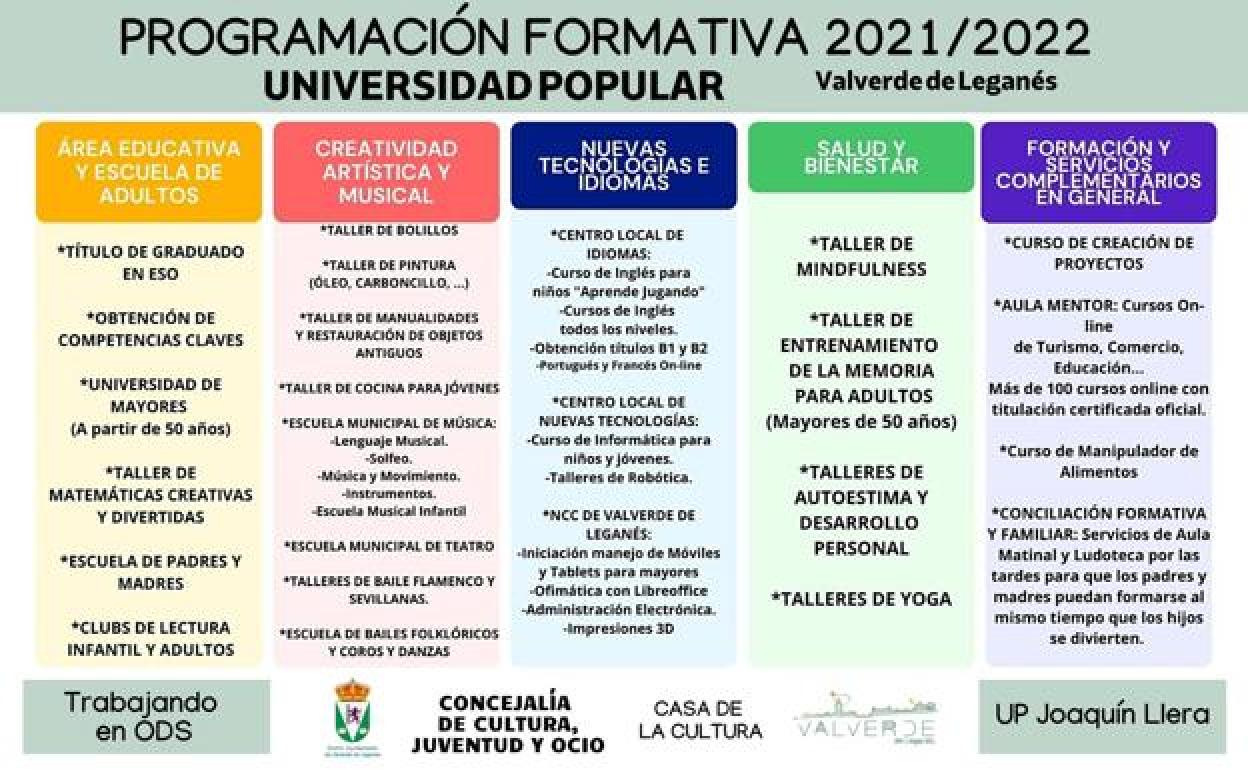 Desde la Concejalía de Cultura, Juventud y Ocio, junto a la Universidad Popular 'Joaquín Llera' de Valverde de Leganés, se ha diseñado un amplio y ... atractivo programa de actividades para el próximo curso 2021 – 2022.