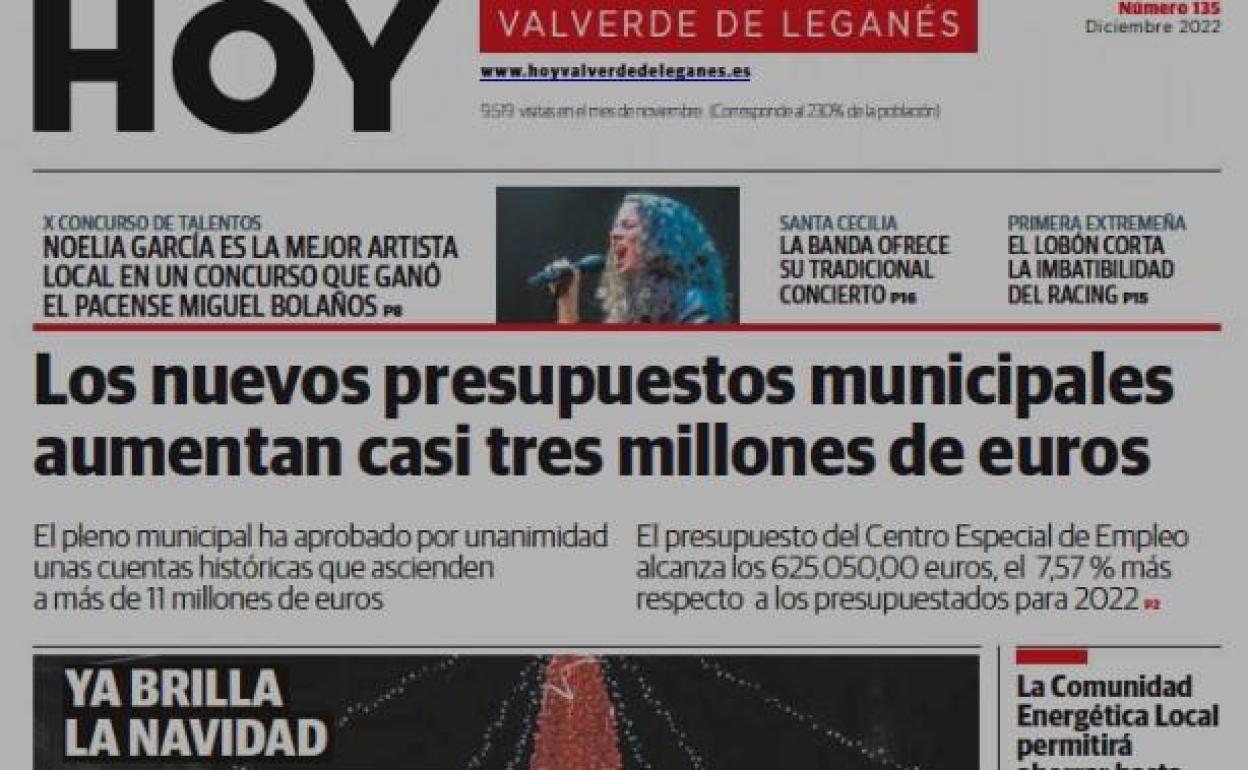 Se abre esta edición con la aprobación de los presupuestos municipales para el ejercicio 2023, que superan los 11 millones de euros. Unas cuentas históricas que fueron aprobadas en el pleno municipal con los votos a favor del grupo socialista y del Partido Popular. También se informa sobre el importante proyecto que se quiere poner en marcha con la creación de la Comunidad Energética Local que permitirá un ahorro en la factura de la luz de hasta el 35%.
