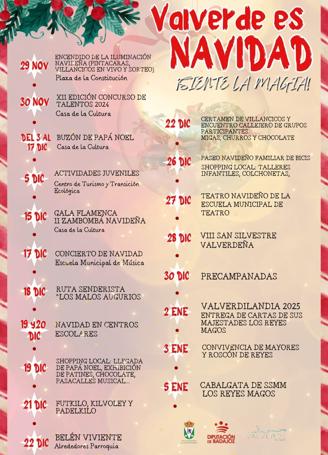 Para despedir el año, las Precampanadas llegarán la noche del 30 de diciembre y ya en 2025, Valverdilandia será el día 2 de enero, junto con la entrega de cartas a Sus Majestades Los Reyes Magos de Oriente; el día 3 será la convivencia de mayores con el roscón de reyes y el 5 de enero finalizará la programación con la cabalgata de SSMM Los Reyes Magos.