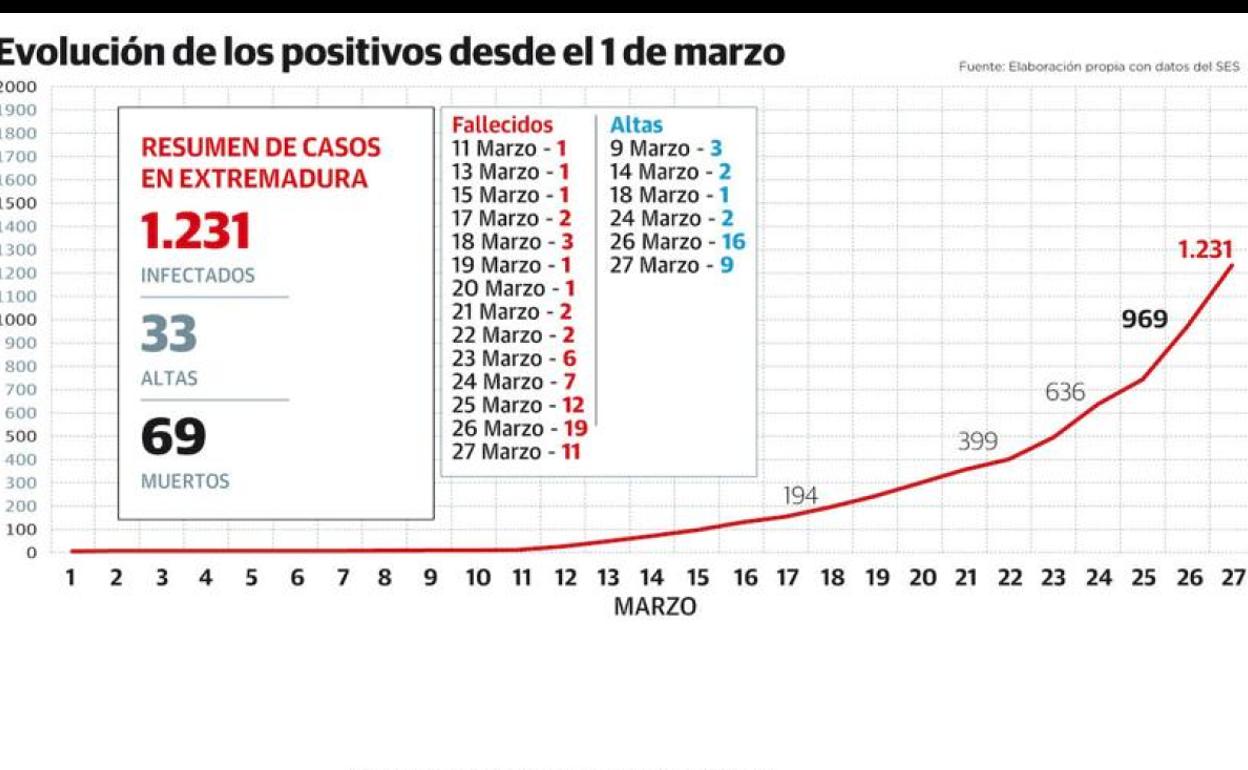 La Junta de Extremadura dio a conocer once nuevos fallecimientos, con lo que suma 69. Se trata de nueve mujeres y dos hombres, con edades entre 60 y 85 años. Solo una de las víctimas mortales procedía de una residencia de mayores.