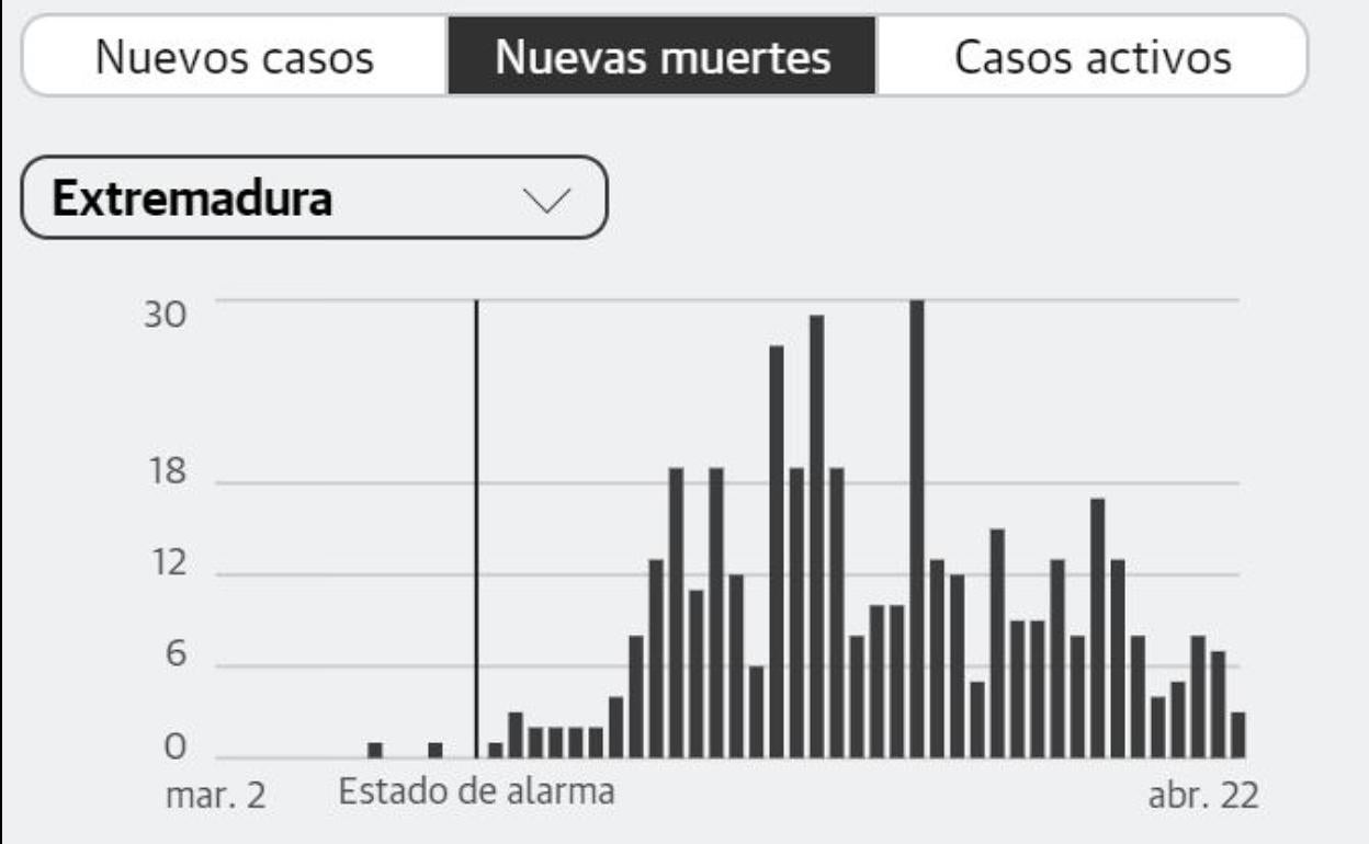 Los números siguen bajando y eso significa que las cosas se están realizando bien en Extremadura. En las últimas 24 horas, se han contabilizado solamente ... 3 fallecidos, la cifra más baja en lo que va de abril. Hasta el momento, el número total de muertes es de 407 (lo que supone el 12,09 %).