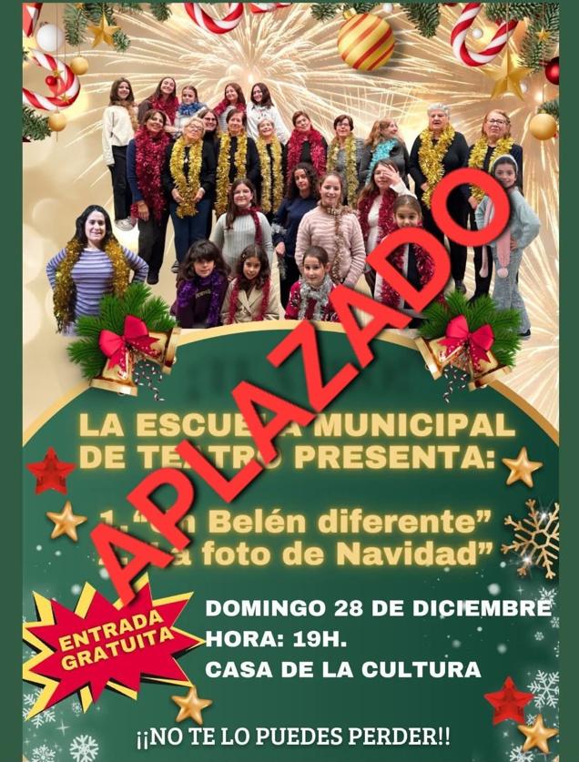 La Escuela Municipal de Teatro ha informado que las representaciones teatrales previstas para este domingo han sido aplazadas al próximo domingo 4 de enero. El motivo del cambio ha sido la indisposición de uno de los protagonistas de las obras.