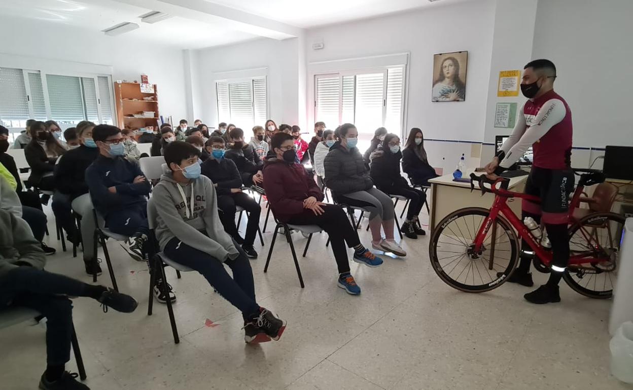 Rubén se dirigió a los alumnos contando su experiencia en el BMX de hace algunos años, y como fue evolucionando para llegar a ser un profesional del ciclismo en carretera, teniendo una discapacidad física. El pacense contó sus vivencias en el mundo del ciclismo, las competiciones en las que participa, cómo son sus entrenamientos y alimentación, cuáles son sus motivaciones dentro del ciclismo, entre muchos aspectos más.