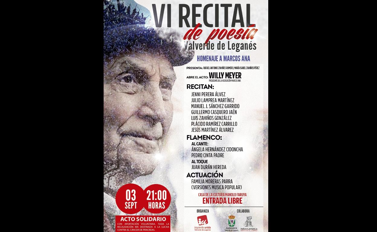 El acto es el próximo 3 de septiembre, sábado, a las 21.00 horas en la Casa de la Cultura. Organiza Izquierda Unidad de Valverde de Leganés, con la colaboración del ayuntamiento y la Peña Flamenca de Valverde.