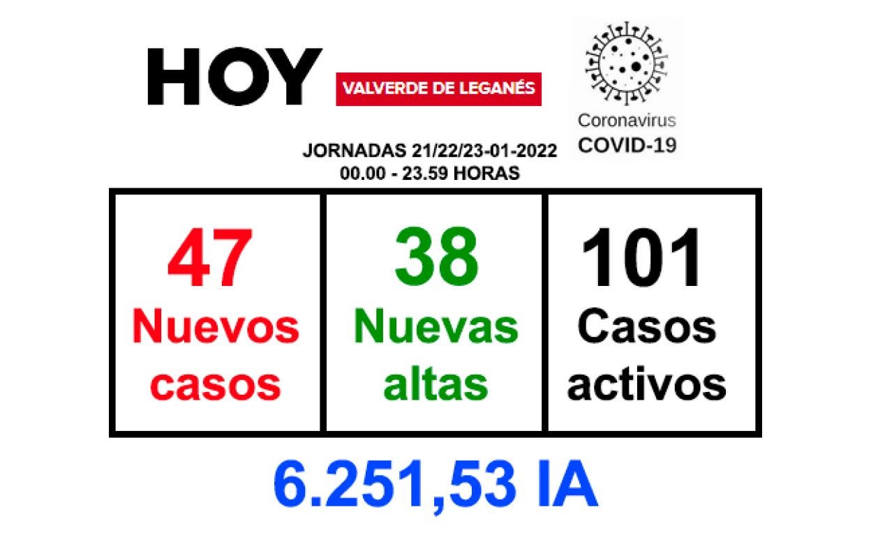 Las jornadas del viernes, sábado y domingo, 21, 22 y 23 de enero respectivamente, han dejado 47 nuevos contagios en Valverde de Leganés. Por otro ... lado, se han notificado 38 recuperaciones. El número de casos activos sube hasta los 101.