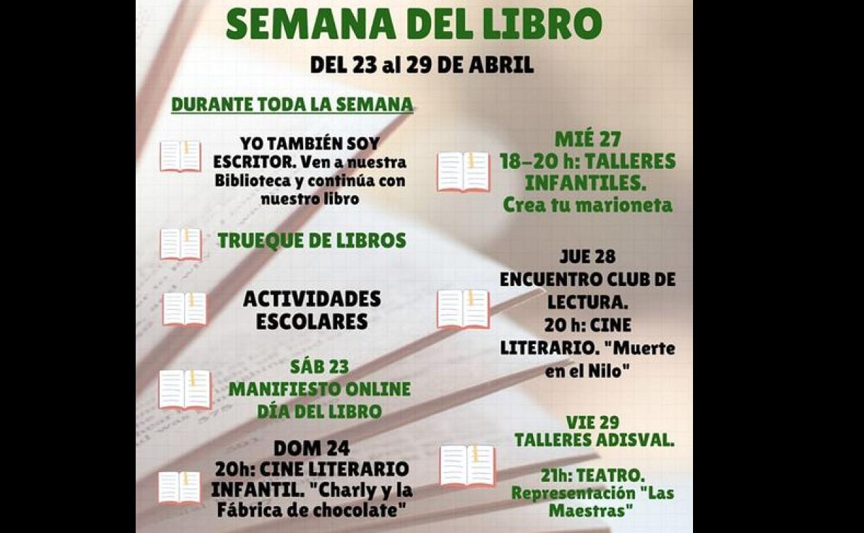 Este sábado 23 de abril se celebra el Día Internacional del Libro, una conmemoración a nivel mundial con el objetivo de fomentar la lectura, la ... industria editorial y la protección intelectual por medio del derecho de autor. En Valverde de Leganés también se conmemora con la puesta en marcha de la Semana del Libro en la que se organizan diferentes actividades dirigidas a todos los públicos.