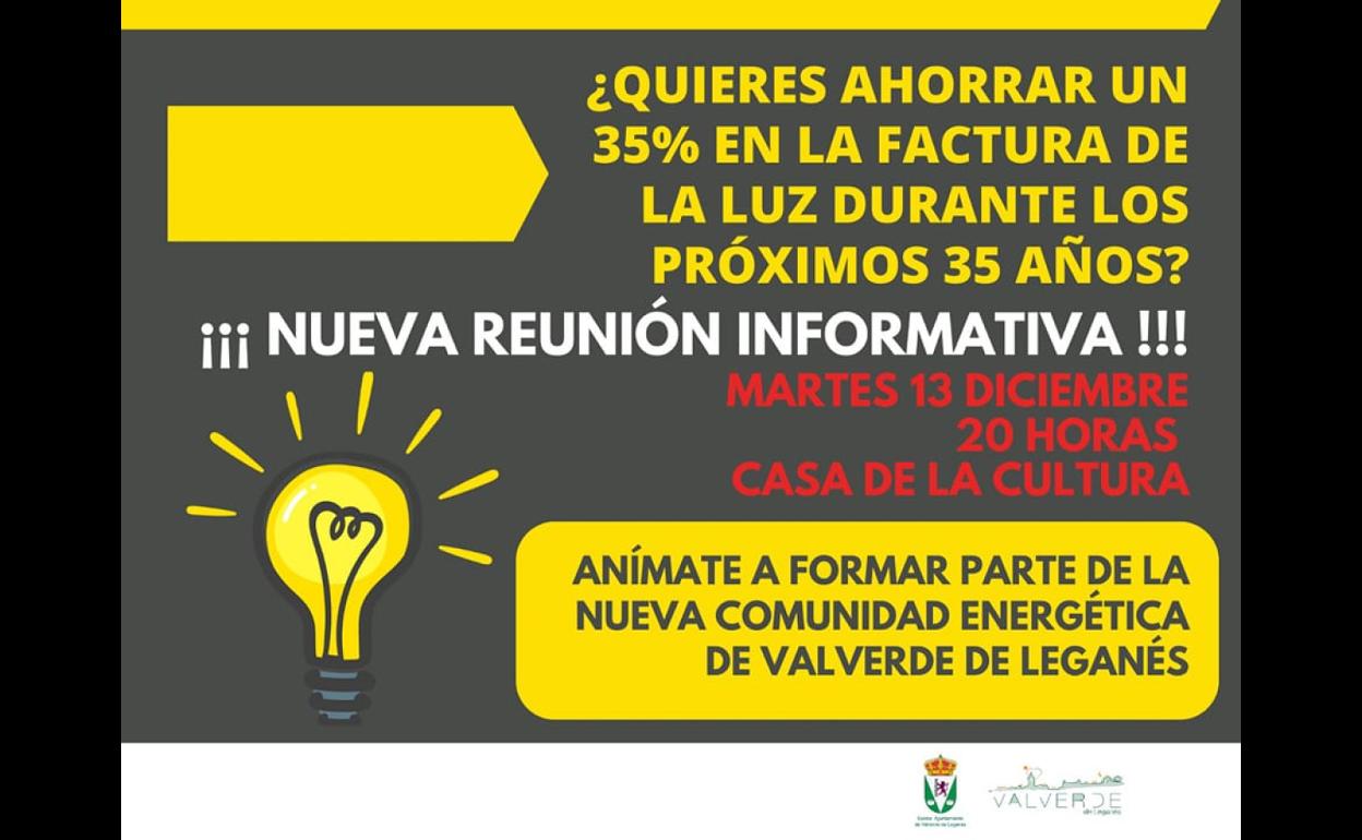 El pasado martes 29 de noviembre la Casa de la Cultura acogió la primera de las reuniones en la que se informó sobre la Comunidad ... Energética Local que se quiere crear en Valverde de Leganés con el objetivo de reducir los costes en las facturas de la luz de los vecinos y empresas de la localidad.