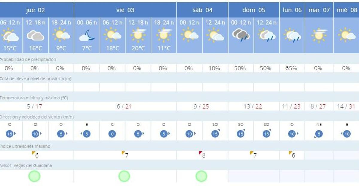 En Valverde de Leganés, la Aemet prevé para este viernes máximas de 21 grados y mínimas de 6, subiendo considerablemente el sábado con máximas de 25 y mínimas de 9. Para el domingo hay previsión de lluvia con una probabilidad de precipitación del 50%, mínimas de 13 y máximas de 22.