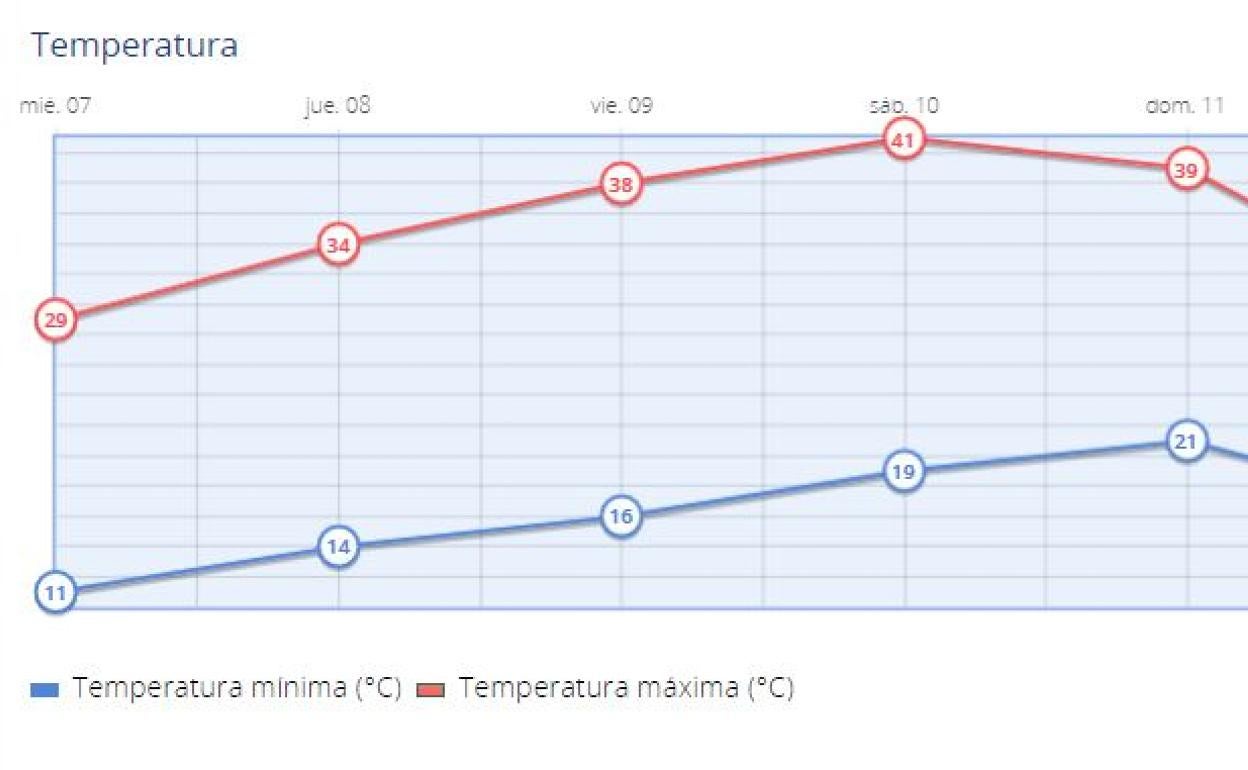 En el día de hoy, miércoles 7 de julio, las mínimas serán de 11 grados mientras que las máximas serán de 29 grados. Mañana jueves ... ya se notará considerablemente la subida, con unas mínimas de 14 y unas máximas de 34. Por su parte, el viernes habrá 16 de mínimas y 38 de máximas. El pico llegará el sábado con 19 grados de mínimas y 41 de máximas. Y para cerrar la semana, el domingo, las mínimas serán de 16 y las máximas de 29.