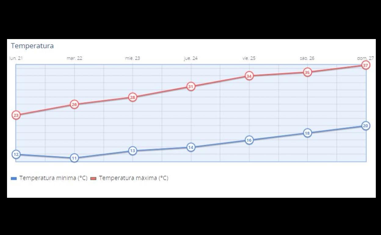 Durante los próximos días, mínimas y máximas irán en ascenso pasando de los 12 y 23 grados (este lunes 21 de junio) a los 20 y 37 grados respectivamente (el domingo 27.