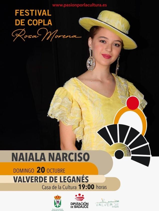 El próximo domingo 20 de octubre, el III Festival de la Copla 'Rosa Morena' puesto en marcha por la Diputación de Badajoz hará parada en ... Valverde de Leganés para ofrecer uno de sus conciertos a los vecinos de la localidad. Dicho espectáculo correrá a cargo de la cantaora Naiala Narciso, que deleitará con su voz a los asistentes a esta cita que tendrá lugar en la Casa de la Cultura a las 19.00 horas.