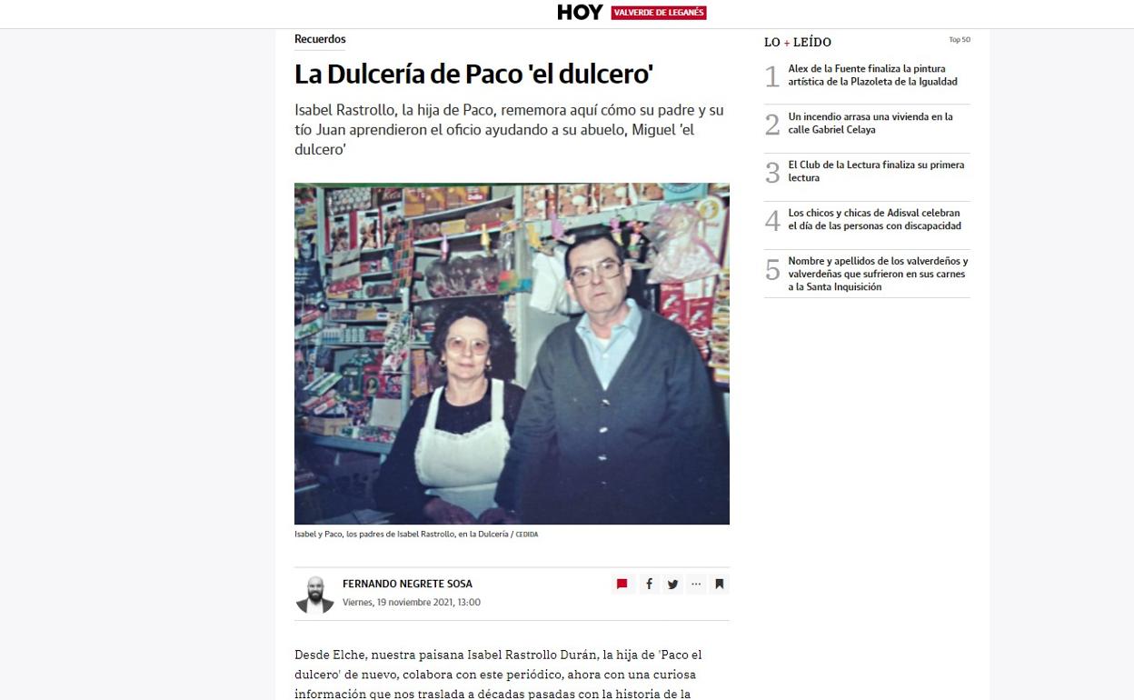 Por último, la información que más visitas recibió fue 'La Dulcería de Paco el dulcero', seguida de la información sobre 'Belén Rastrollo Palacios, protagonista de la primera exposición en el Centro del Conocimiento', tercera es la del 'Actual pichichi de la Tercera División es el valverdeño Borja Romero', y cuarta la información de la riada '24 años atrás'.