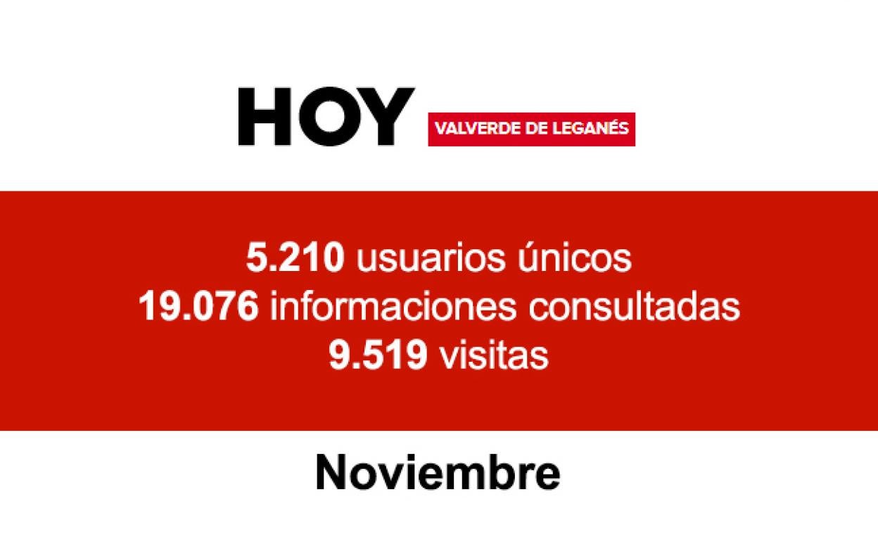 El Hiperlocal HOY Valverde de Leganés tuvo en el pasado mes de noviembre un total de 19.076 informaciones consultadas por los 5.210 usuarios ... únicos con los que ha finalizado el mes, que han realizado 9.519 visitas.