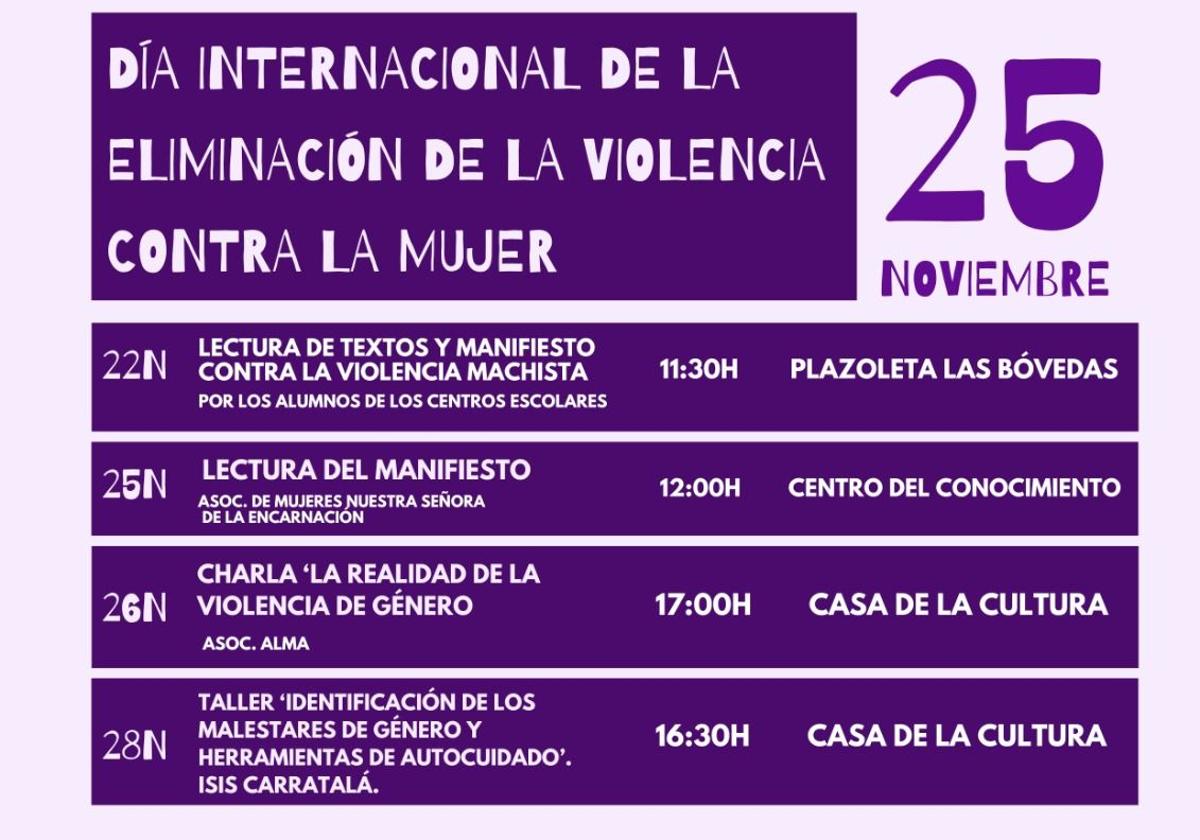 La programación continuará el lunes 25, Día Mundial Contra la Violencia de Género. A las 12.00 horas será la lectura oficial del manifiesto a cargo de la Asociación de Mujeres Nuestra Señora de la Encarnación, en el Centro del Conocimiento. El martes a las 17.00 horas, la Casa de la Cultura acogerá la charla 'La realidad de la violencia de género', a cargo de la Asociación Alam; y el miércoles, a las 16.30 horas y también en la Casa de la Cultura, Isis Carratalá ofrecerá el taller 'Identificación de los malestares de género y herramientas de autocuidado'.