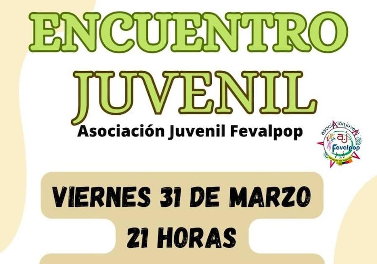 La Asociación Juvenil Fevalpop ha organizado un encuentro juvenil para este viernes 31 de marzo, con el objetivo de que los jóvenes participantes escuchen todas ... las propuestas y actividades que vendrán en los próximos meses y aporten ideas y sugerencias para tener en cuenta.