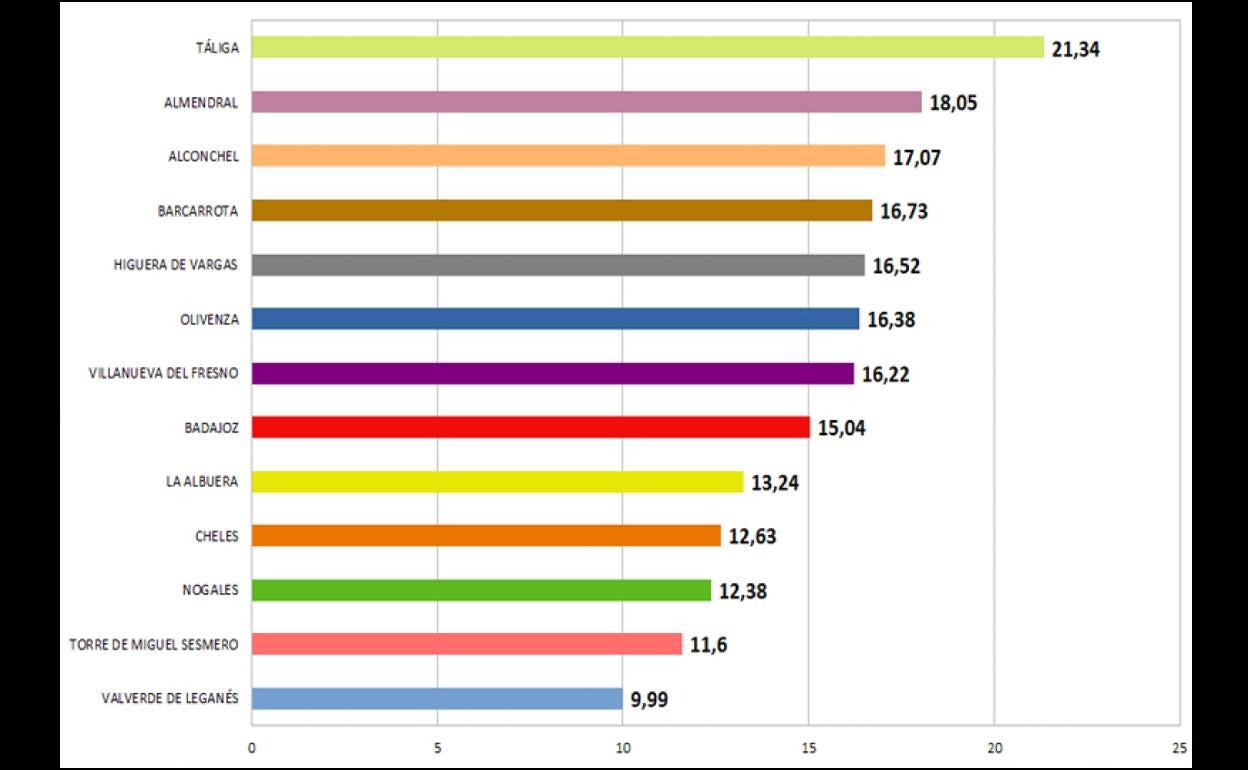 Por otro lado, Valverde es la localidad con menor tasa de todas la de los alrededores. Por detrás aparecen Torre de Miguel Sesmero (95 parados y tasa de 11,60%), Nogales (53 parados y 12,38%), Cheles (94 parados y 12,63%), La Albuera (169 parados y 13,24%), Badajoz (15.035 parados y 15,04%), Villanueva del Fresno (357 parados y 16,22%), Olivenza (1.284 parados y 16,38%), Higuera de Vargas (202 parados y 16,52%), Barcarrota (372 parados y 16,73%), Alconchel (184 parados y 17,07%), Almendral (144 parados y 18,05%) y Táliga (89 parados y 31,34%).